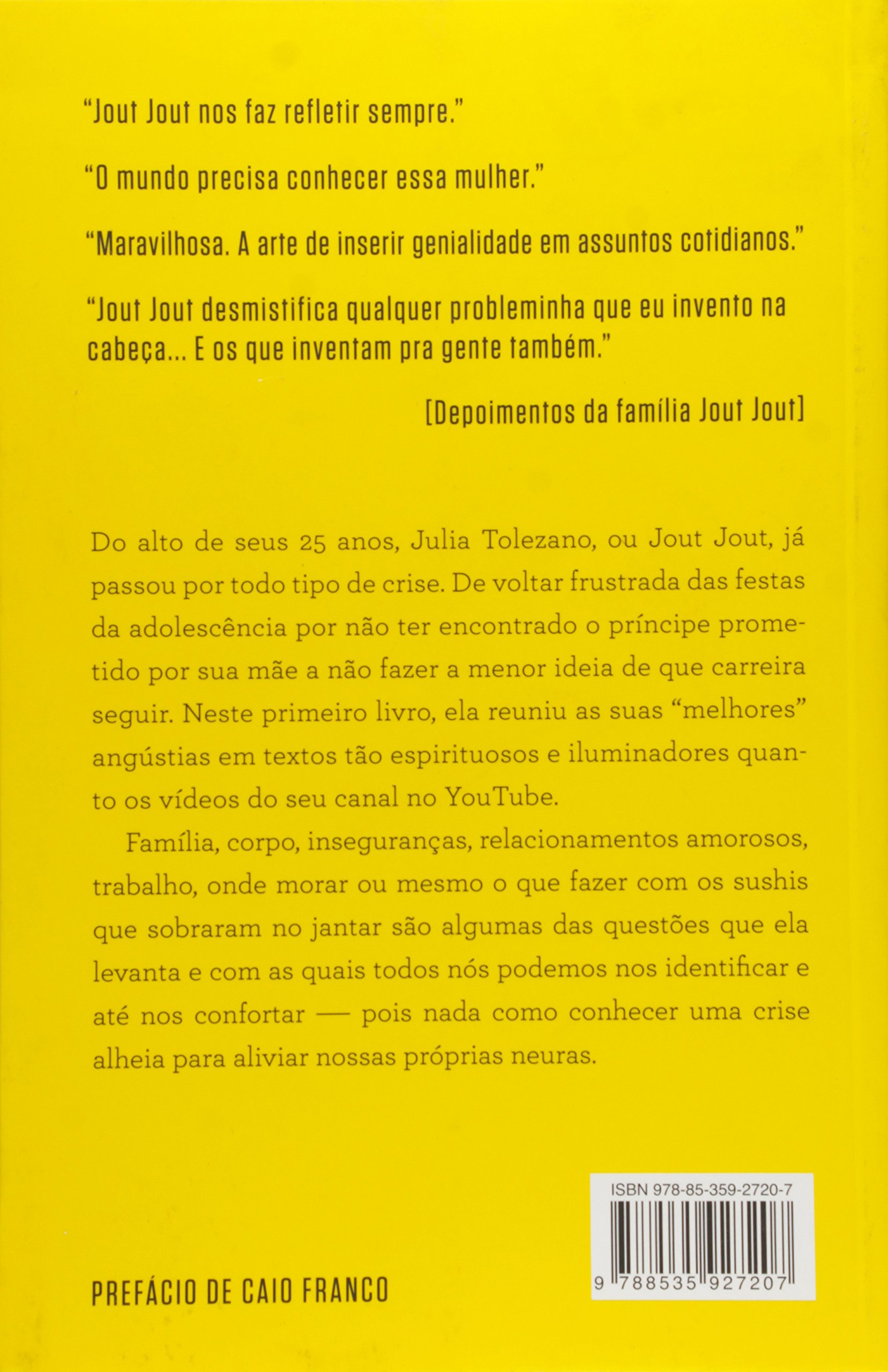 Jout jout tá todo mundo mal o livro das crises. Família aparência inseguranças relacionamentos amorosos trabalho onde morar e o que fazer com os sushis que sobraram no prato são algumas das questões que ela levanta. A narrativa da jout jout é sagaz e ela escreve realmente bem. Em tá todo mundo mal ela reuniu as suas melhores angústias em textos tão divertidos e inspirados quanto os vídeos de. O que me incomodou no livro foram as crises abordadas. Família aparência inseguranças relacionamentos amorosos trabalho onde morar e o que fazer com os sushis que sobraram no prato são algumas das questões que ela levanta. E um livro que fala abertamente do que tantas vezes tentamos abafar esconder de todas aquelas crises e como gosto de falar surtos que a gente passa na vida precisa ser lido. O livro das crises autor. Em tá todo mundo mal ela reuniu as suas melhores angústias em textos tão divertidos e inspirados quanto os vídeos de seu canal no youtube jout jout prazer. Companhia das letras 0 avaliações sinopse. Do alto de seus 25 anos julia tolezano ou jout jout já passou por todo tipo de crise. Tá todo mundo em crise livro leve gostoso e super rápido de ler. Outras pareciam muito supérfluas principalmente para alguém como a julia. Do alto de seus 25 anos julia tolezano mais conhecida como jout jout já passou por todo tipo de crise.