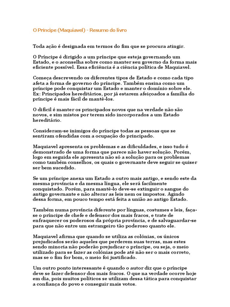 Resumo do livro o principe de maquiavel. Para saber mais sobre nicolau maquiavel acesse aqui. Resumo do o príncipe. E o livro é sensacional uma frase marcante de maquiavel é. Este resumo traz esclarecimentos sobre os principais fatos ideias e personagens presentes em cada capítulo do livro para um entendimento rápido profundo e eficiente do enredo tudo numa linguagem clara e atual. O resumo do livro o príncipe de maquiavel é buscado com muita frequência por alunos do ensino médio. Isto porque esta obra faz parte de algumas das leituras obrigatórias uma vez que esta obra faz parte dos clássicos absolutos da literatura. De arranque maquiavel exibe os tipos de principado existentes e aponta as distinções de cada um deles. Este resumo sobre o livro o príncipe de maquiavel pretende te passar de forma rápida uma visão geral do livro organizada por capítulos. Apenas o conhecimento irá lhe servir como aliado confiável e mesmo assim isso não irá garantir de antemão bons resultados. Ou de todos aqueles que navegam sem uma bússola o príncipe terá de fazer escolhas a cada momento. Caso você tenha interesse em adquirí lo clique aqui. O autor do livro nicolau maquiavel escreveu esta importante obra que se tornou um dos maiores ícones da literatura italiana e mundial em 1513. Como nicolau morreu em 1527 a primeira edição do livro já é considerada uma publicação póstuma. O autor na verdade escreveu um guia de conselhos para governantes que de acordo com sua visão deveriam ignorar a moral e o respeito para permanecerem no poder e o deu de presente ao príncipe lorenzo de médice.