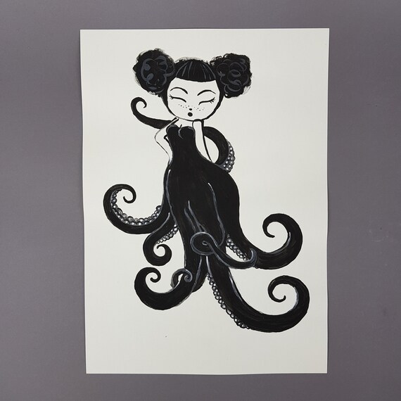 Original Painting Art Pop Surrealism Octopus Girl Gothic Creepy Kawaii Outsider Art Pop Art Lowbrow