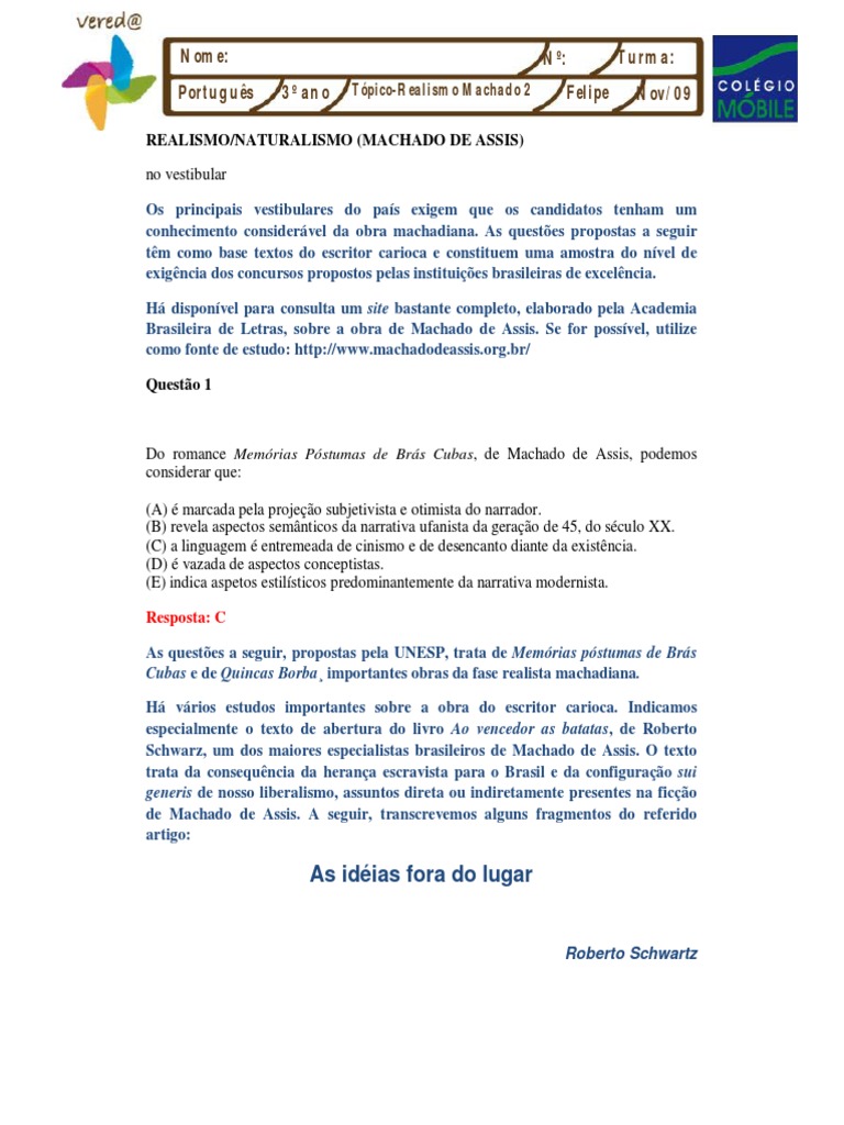 Questões Sobre Memórias Póstumas De Brás Cubas