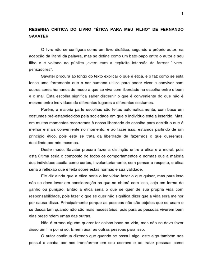 Resumo do livro etica para meu filho. ética para meu filho fernando savater o livro é dirigido para adolescentes e em especial o próprio filho do autor. Em ética para meu filho o autor através de uma conversa entre pai e filho separa ações e exemplos do que as pessoas podem devem ou têm capacidade de fazer ou nãoe comparando essas mesmas ações a seres animados ou inanimados ele visa apresentar uma série de ideias e pensamentos tentando estimular no leitor o desenvolvimento de novos livres pensadores. Advertncia antipedaggica este livro foi pensado e escrito para os adolescentes provavelmente ensinar pouco aos professores. Em ética para meu filho o autor fernando savater através de uma conversa entre pai e filho separa ações e exemplos do que podemos devemos ou temos capacidade de fazer ou não. Resenha do livro ética para o meu filho de fernando savater. O objetivo deste livro no formar bons pensadores nem maus pensadores mas estimular o desenvolvimento de livres pensadores. Resenha crítica do livro ética para meu filho de fernando savater o livro não se configura como um livro didático segundo o próprio autor na acepção da literal da palavra mas se define como um bate papo entre o autor e seu filho e é voltado ao público jovem com a explícita intensão de formar livres pensadores. Tica para meu filho. Resenha do livro ética para meu filho de fernando savater a ética segundo o livro de fernando savater ética para meu filho que consiste numa narração descontraída do autor para seu filho de apenas quinze anos é uma ferramenta usada como forma de se viver bem de conseguirmos viver uma vida boa que valha realmente a pena ser vivida. Por lucas alves borges 03122014 resenha. Como ensinar ou dar dicas fundamentais para adolescentes sobre ética sem ser chato paternalista ou imperativo.