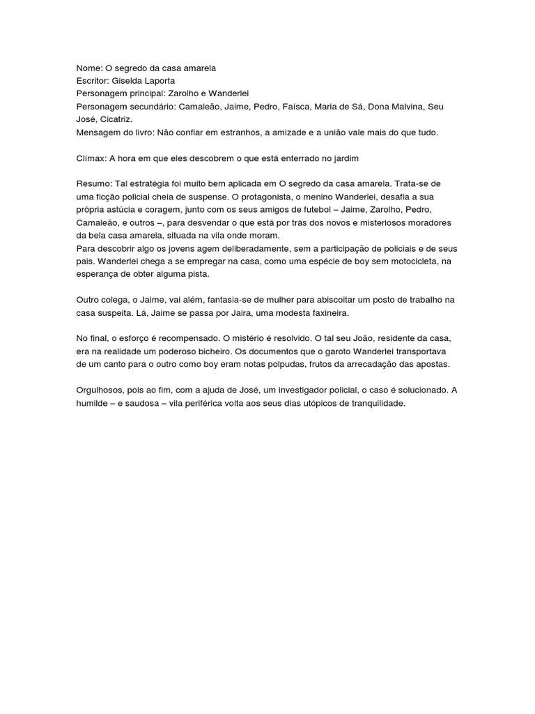 Abaixo estão as fotos do resumo do livro o segredo da casa amarela que o administrador Resenhas de Livros blog 2019 coletou.