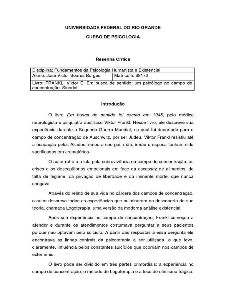 Resenha Acadêmica Em Busca De Sentido Monografia October