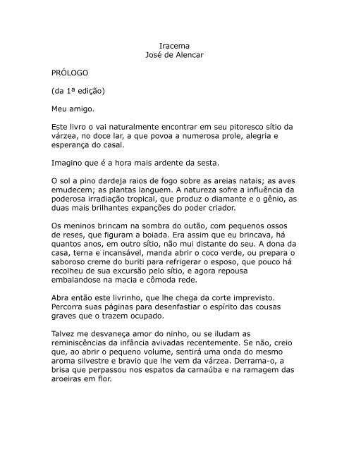 Traz também um petisquinho porque a conversa vai longe mas você não pode perder o resumo. A obra iracema de josé de alencar narra o trágico romance entre iracema a virgem dos lábios de mel e martim o primeiro colonizador português do ceará. Uma resenha e explicação sobre a obra iracema de josé de alencar. Iracema resumo e análise do livro de josé de alencar escrito em prosa poética esse romance é um dos principais representantes da vertente indianista do movimento romântico. é considerado um poema em forma de prosa com características.