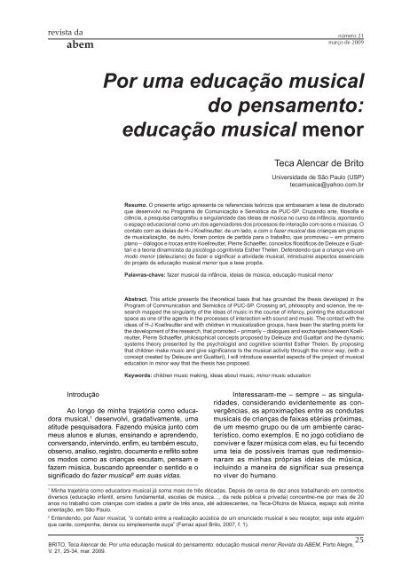 Livro musica na educação infantil teca alencar pdf. Compre musica na educacao infantil de teca alencar de brito no maior acervo de livros do brasil. Acesse o buscapé e clique no link para comparar os preços. Propostas para a formação integral da criança de teca alencar de britorecomendo a leitura deste livro pois o considero um dos mais importantes referenciais direcionados à educação musical de crianças na atualidade. 12 a música na educação infantil em documentos oficiais e escolares 33 13 música na educação infantil. A música no contexto da educação infantil vem ao longo de sua história atendendo a vários objetivos alguns dos quais alheios às questões próprias. Outras reflexões 44 131 algumas possibilidades da música na educação infantil 45 132 o professor de música e o professor unidocente da educação infantil 49 133 sobre práticas musicais na escola 55. Muito pertinente esse postvou comprar esse livro para a biblioteca. Teca brito música na educacao infantil 1. Propostas para a formação integral da criança de teca alencar de brito por carlos roberto prestes lopesbritoteca alencar de. Trazendo uma resenha do livro música na educação infantil. Ideias e práticas correntes. Acesse nosso site e veja mais informações sobre. Música na educação infantil propostas para a formação integral da crianç de teca alencar de brito. Schafer e koellreutter entre outros e oferece aos educadores que trabalham com crianças.