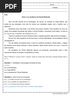 Interpretacao De Texto Artur E Os Cavaleiros Da Tavola