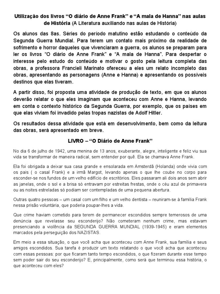 Questões sobre o livro o diário de anne frank com gabarito. Anne frank inicia seu diário falando sobre seu aniversário que ocorreu no dia 12 de junho de 1942 quando ela ganhou da sua mãe o diário em questãoalém disso a menina fala sobre sua família e amigos. O diário de anne frank com interpretaçãogabarito texto. às vezes acontecem casos emocionantes para relatar como bombardeios e tentativas de assaltos no meio da noite. A durante a 1ª guerra mundial. Uma experiência de leitura e escrita com alunos da educação de jovens e adultos em fase de letramento agregando as mídias livro foto internet e blog para uma aprendizagem significativa com conteúdo e contexto histórico. Leiam e respondam tudo com muita atenção. E durante a revolução francesa. Qualquer dúvida me avisem. Conforme o prometido seguem as perguntas para o nosso quiz do livro o diário de anne frank. Tenho vontade de escrever e necessidade ainda maior de desabafar tudo que está preso no meu peito. O diário de anne pois em suas mais íntimas profundezas a juventude é mais solitária que a velhice. O diário de anne frank na eja. Anne frank tenta descrever o máximo possível a vida cotidiana da casa de trás e as notícias que chegam de fora.