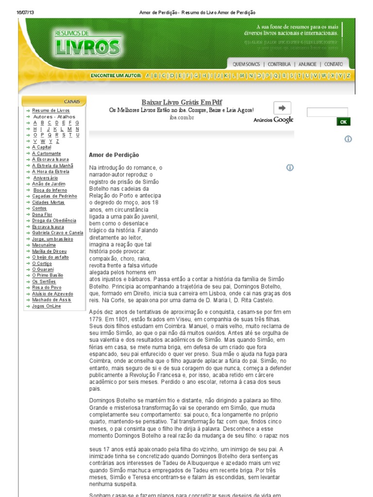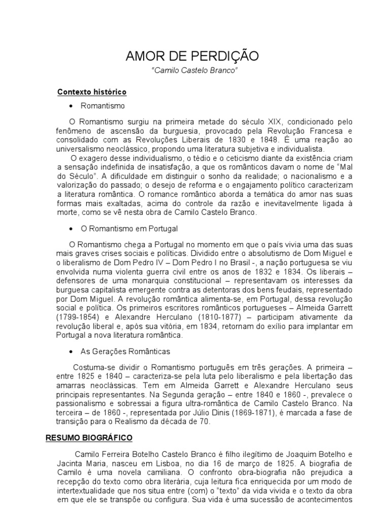 Abaixo estão as fotos do resumo do livro amor de perdição camilo castelo branco que o administrador blog Resenhas de Livros 2019 coletou.