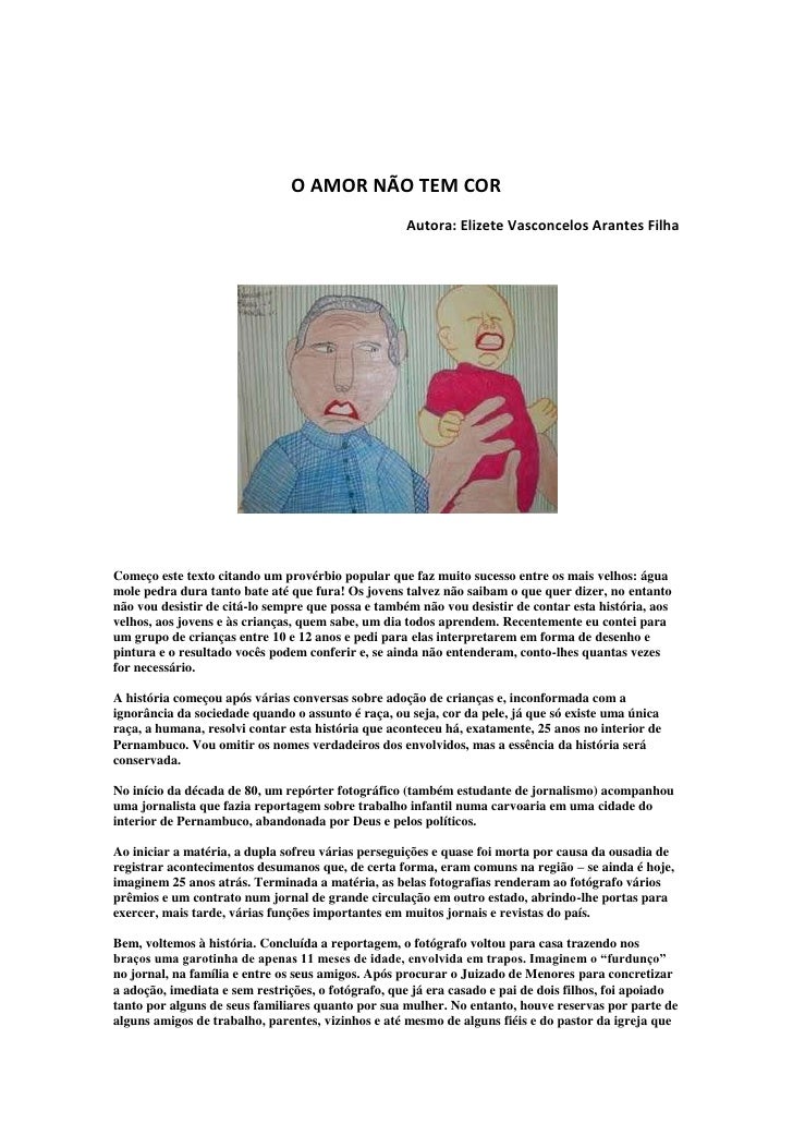 Resumo do livro amor não tem cor. Resumo de amor não tem cor giselda laporta nicolelis. A autora giselda nicolelis consegue descrever o quão podemos mudar nossos conceitospré conceitos quando estamos diante de um grande desafio cercado. O amor não tem cor fala sobre o processo de adoção onde marijane tem uma idéia de adotar uma criança sem preferencia de cor e jeferson o seu esposo só aceita adotar uma menina loira dos olhos azuis esse fenotipo corresponde a 1 das crianças que moram em abrigos no brasiljeferson que se assume como branco e é pardo de origem faz um auto racismo e racismo a sua família. Milhares de resumos em um só lugar. Otávio sugere que ela adote um filho ela adora a ideia. Porem ele quer adotar uma menina loira de olhos azuis e marijane não se importa com a etnia da criança. César se vc nao sabe aqui e um lugar onde todos tem o direito de fazer a pergunta que quer e nao e vc qua vai mudar se vc nao quer ajudar nem entre no yahoo. Resumo do livro logo abaixo disponibilizamos um breve resumo do livro o amor não tem cor para que você tenha uma idéia do assunto do qual ele trata. Um dia seu patrão dr. Amor não tem cor giselda laporta nicolelis marijane é casada com jefferson. Significado dos nomes tabagismo vitaminas apostilas portal da cultura significado dos sonhos portal das receitas curiosidades livros grátis jogos online ciências biológicas. Me deem o resumo do livro o amor nao tem cor. é da giselda lapota e na verdade e amor nao tem cor me ajudem. Ela e seu marido jefferson sofreram muito quando jovempois seus pai não aceitavam o namoro dos doispois ele era da raça negra e ela era branca.
