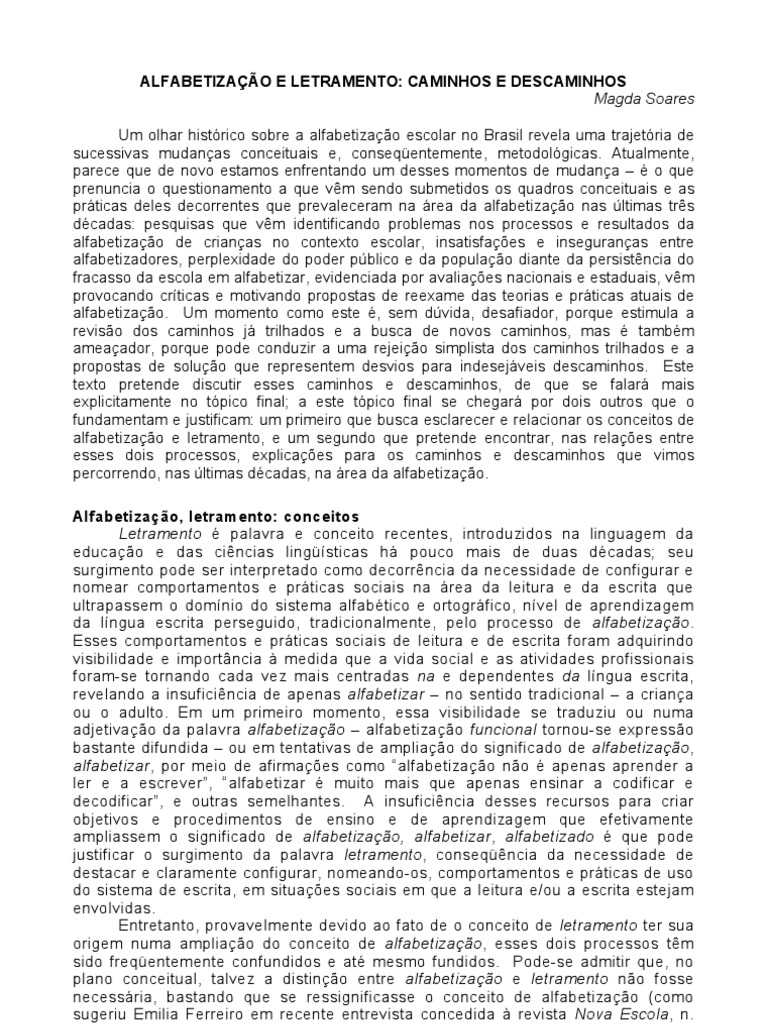 Exerci o magistério por 30 anos e sempre dedicados a alfabetizacao de criancas. Artur gomes de morais em seu livro sistema de escrita alfabética apresenta. Caminhos e descaminhos magda soares revista pátio n29 fevabr 2004 by neildalan in types magazinesnewspapers. As muitas facetas magda soaresuniversidade federal de minas gerais centro de alfabetização leitura e escrita. Por que nossas estatísticas sobre o analfabetismo e sobre o baixo desempenho escolar nos primeiros ciclos do ensino fundamental insistem em nos revelar números tão incômodos. Levantando a história da educação superior brasileira desde a criação da primeira escola normal ainda na colônia passando pelo reino império e república até chegar à reforma universitária de 1968 a autora pondera se a escola lugar de atuação profissional não deveria ser. Compre alfabetizacao e letramento de magda soares no maior acervo de livros do brasil. O ceale integra a rede nacional de centros de formação continuada do ministério da educação. Durante minha graduação em pedagogia assisti palestras de magda soares e trabalhei muitos textos de sua autoria. Este livro de maisa gb. Alfabetização e letramento magda soares. Magda soares uma das maiores especialistas brasileiras em alfabetização nos propõe algumas possibilidades de resposta para tais perguntas e nos impõe novas provocações.