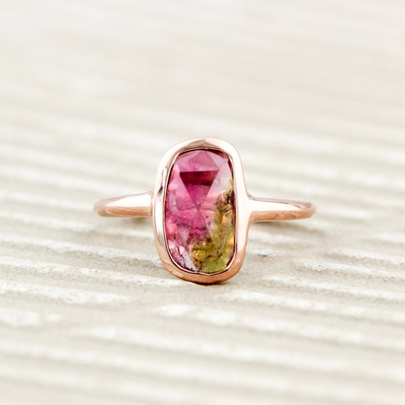 Rose Gold Rose Cut Watermelon Tourmaline Ring Bi Color Tourmaline Calming Ring Pink Green October Birthstone Ring Gift For Mom