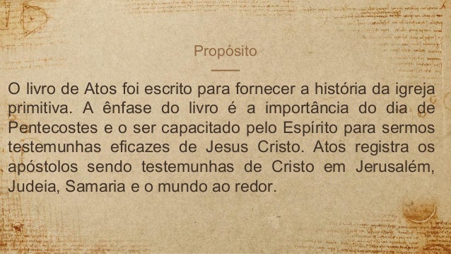 Quando foi escrito o livro de atos. A ênfase do livro é a importância do dia de pentecostes e o ser capacitado pelo espírito para sermos testemunhas eficazes de jesus cristo. A ênfase do livro é a importância do dia de pentecostes e o ser capacitado pelo espírito para serem testemunhas eficazes de jesus cristo. O livro de atos foi escrito para fornecer uma história da igreja primitiva. Quem escreveu o livro de atos dos apóstolos foi o evangelista lucas o médico companheiro de viagens missionárias do apóstolo paulo. O livro de atos foi provavelmente escrito entre 61 64 dc. O livro de atos foi escrito para fornecer uma história da igreja primitiva. Uma vez que o livro de atos faz silêncio em relação ao julgamento de paulo há quem pense que foi redigido entre 58 60 dc. Teria sido escrito por lucas testemunha ocular dos acontecimentos narrados no livro uma vez que foi companheiro de paulo em algumas viagens col 414. Ele abrange cerca de 30 anos ad 33 63 a 65 sendo o segundo livro escrito por lucas 8 o livro de atos narra a história da era da igreja apostólica cristã primitiva com particular ênfase para o ministério dos doze apóstolos e de paulo de tarso. A ênfase do livro é a importância do dia de pentecostes e o ser capacitado pelo espírito para sermos testemunhas eficazes de jesus cristo. Lucas não apenas escreveu o livro de atos mas também o terceiro evangelho que traz seu nome. Olá debora de são paulo sp. Atos registra os apóstolos sendo testemunhas de cristo em jerusalém judeia samaria e o mundo ao redor.