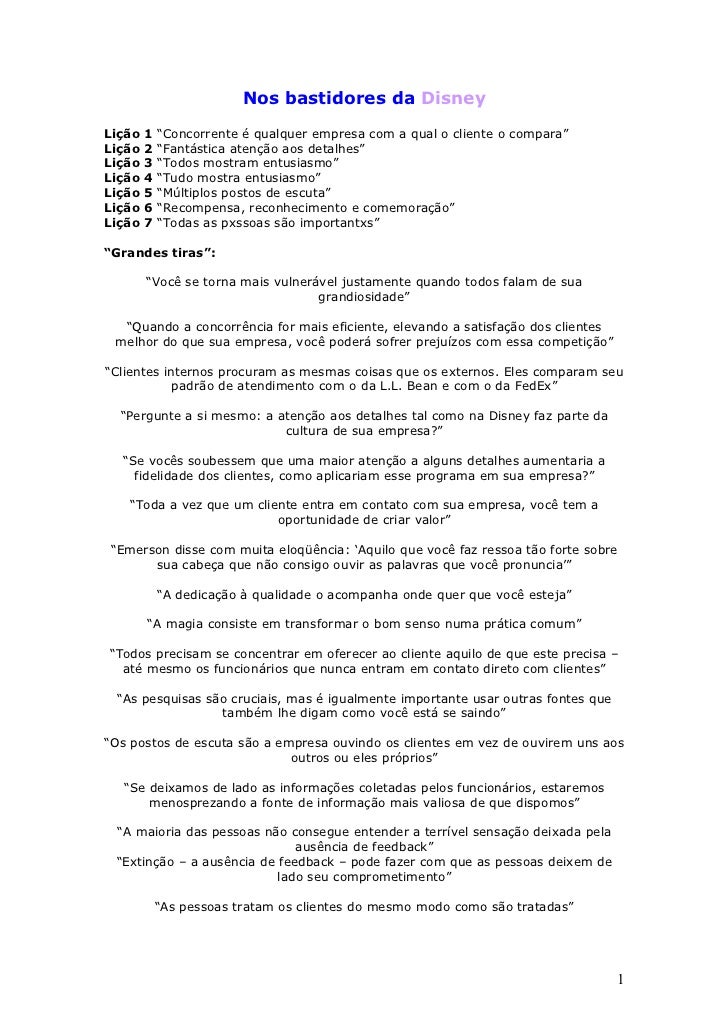 Resumo do livro nos bastidores da disney. Orlando cinco profissionais viajaram para orlando a negócios em busca de saber os segredos da. Como será que são as engrenagens por trás da disney. Nos bastidores da disney por capítulo. Quase 70 dos frequentadores do reino encantado já o visitaram antes. Nos bastidores da disney rafaella gonçalves de souza o livro nos bastidores da disney escrito por tom connellan 2010 conta a história de cinco gestores com diferentes perfis são eles bill judy carmem alan e don que vão em busca de aperfeiçoamento e conhecimento através da disneylândia. Capítulo 1 próxima parada. Tem um índice de 70 de clientes por ano. Leia este humanas resenha e mais 759000 outros documentos de pesquisas. Em seu livro nos bastidores da disney tom connellan consegue através de a ficção apresentar as melhores práticas ideias que podem ser empregadas por empresas de diferentes ramos de negócio a fim de aprimorar sua qualidade de atendimento fazendo com que os clientes saiam satisfeitos. Cultura e o sucesso d rupo podem ser aplicados de exemplos que aju resumo do livro nos bastidores da disney premium by apasauza mapta 31 2012 6 pages o sucesso da disneyworld é incontestável. Em todo semestre existe aquele livro do semestre pois bem do semestre que passou foi um chamado. Quem ainda não conhece sonha com o grande dia em que verá pessoalmente o rato mais famoso do mundo mickey mouse. Aquela que é a melhor experiência do mundo para o público tem várias manhas e uma obsessão não muito saudável por detalhes. Nos bastidores da disney eu umas das milhares de pessoas que amam e querem conhecer a disney num futuro próximo não fiquei decepcionada para ler.