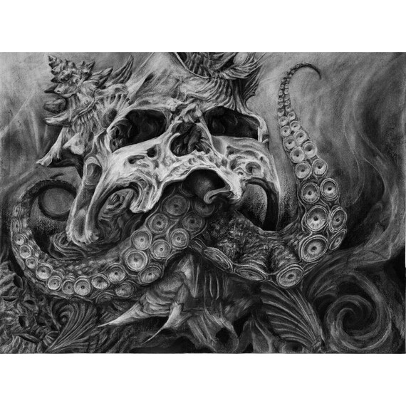 Fine Art Giclee Print Davy Skull Sea Shells Octopus Tentacles Ocean Pirate Theme Charcoal Drawing