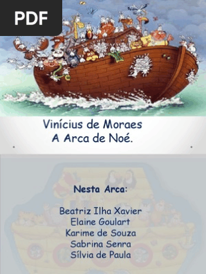 Os poemas infantis de vinicius de moraes são declamados de cor por crianças e adultos graças às deliciosas versões musicais de a arca de noé. Capa do primeiro disco da série a arca de noélançado em os anos correm apressados. O sol ao véu transparente da chuva de ouro e de prata resplandece resplendente no céu no chão na cascata. Capa e lombada com sinais de manuseio capa e contra capa possuem marca de dobra capa com etiqueta contra capa contem marca de dobra miolo ok. Sete em cores de repente o arco íris se desata na água límpida e contente do ribeirinho da mata. E abre se a porta da arca lentamente surgem francas a alegria e as barbas brancas do prudente patriarca. Outros livros de vinicius de moraes para ler online. Acessórios para tablet voltar voltar.