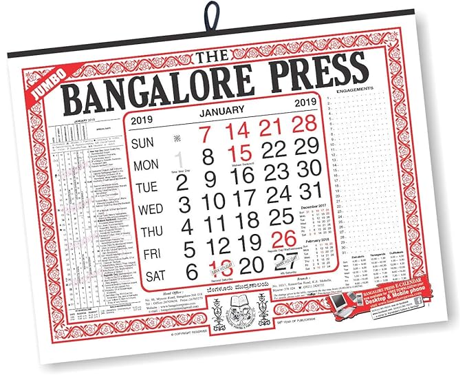 The Bangalore Press English Combination Of Calendars 2019 Jumbo Standard Mallige Panchanga Darshini Calendar