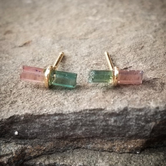 Tourmaline Earrings October Birthstone Earrings Raw Crystal Earrings Watermelon Raw Tourmaline Jewelry Womens Gift Wife Gift 14k Gold Studs
