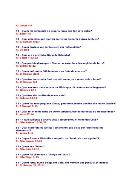 Perguntas e respostas sobre o livro de ester. Disponibilizei na web por achar que pode ser útil para outros líderes. Precisando preparar uma gincana bíblica. Ele reinou desde a índia até a etiópia. A de ouro e de prata sobre um pavimento de pórfiro b de mármore e de alabastro e de pedras preciosas 11. Acesse também teste de qi bíblico e gincana 48 perguntas fáceis. Procura apresentar te a deus aprovado como obreiro que no tem de que se envergonhar que maneja bem a palavra da verdade 2tm 215acf. Precisando preparar uma gincana bíblica. Livro de jonas. Esse livro narra a história de ester mardoqueu hamã e assuero. Que tipo de vaso foi usado para se beber vinho. O lá confira mais esse excelente concurso bíblico com 32 perguntas bíblicas com respostas de nível mais difícil sobre o livro de 1 samuel incluindo a história de dabi e goliascada pergunta tem 3 alternativas com apenas 1 resposta correta em slides do power point. Maratona bíblica sobre o livro de ester anísio renato de andrade elaborei este roteiro e perguntas para a realização de uma maratona entre os jovens da igreja batista de carlos prates. Quiz de 50 perguntas bíblicas difíceis que irão desafiar o teu conhecimento bíblico e farão aprender ainda mais sobre a palavra de deus. Qual o alcance do reino de assuero.