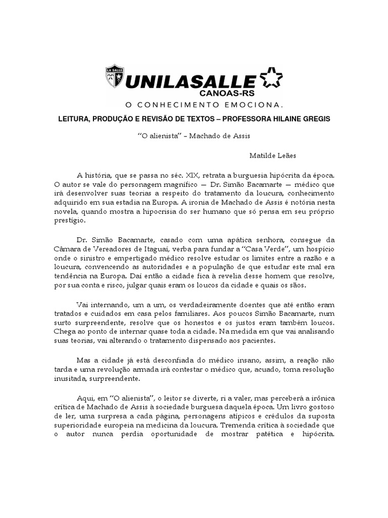 Resumo Do Livro O Alienista De Redação Serviço Personalizado