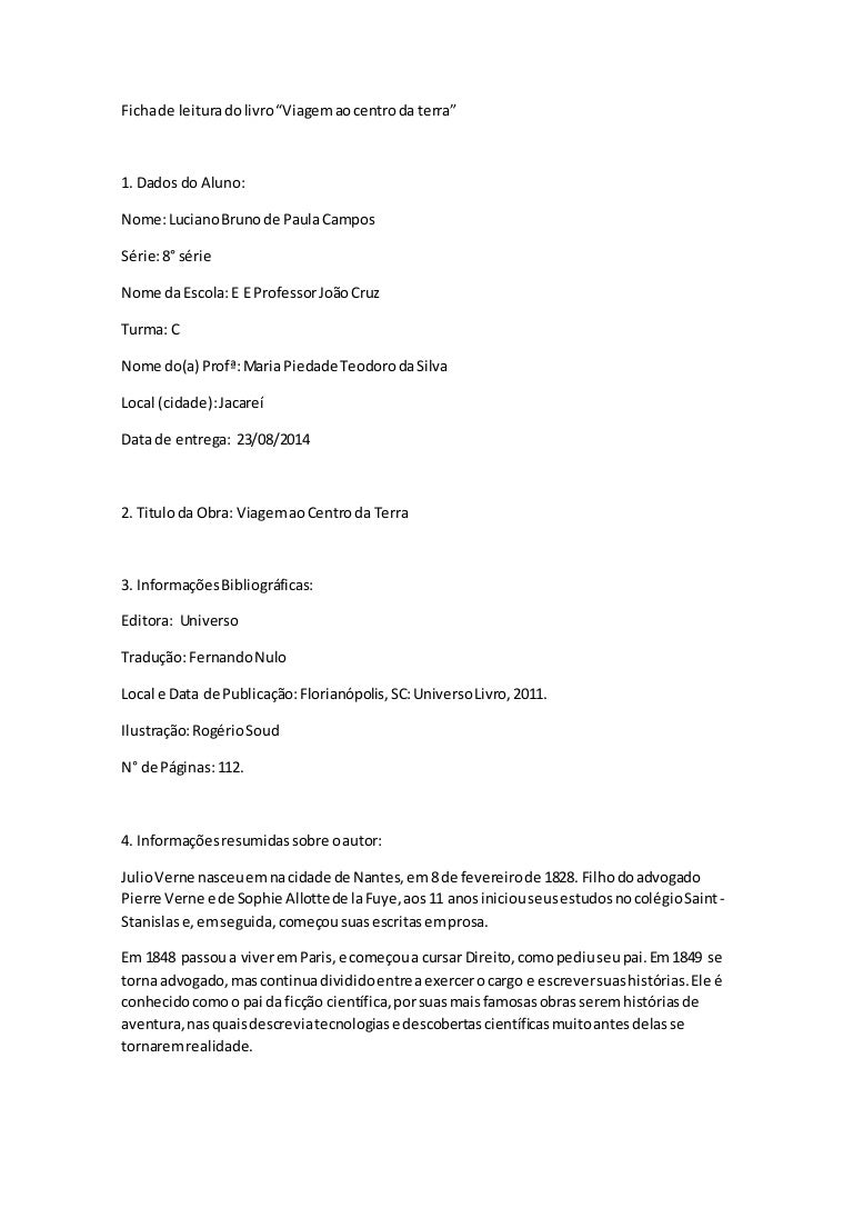 Ficha De Leitura Viagem Ao Centro Da Terra