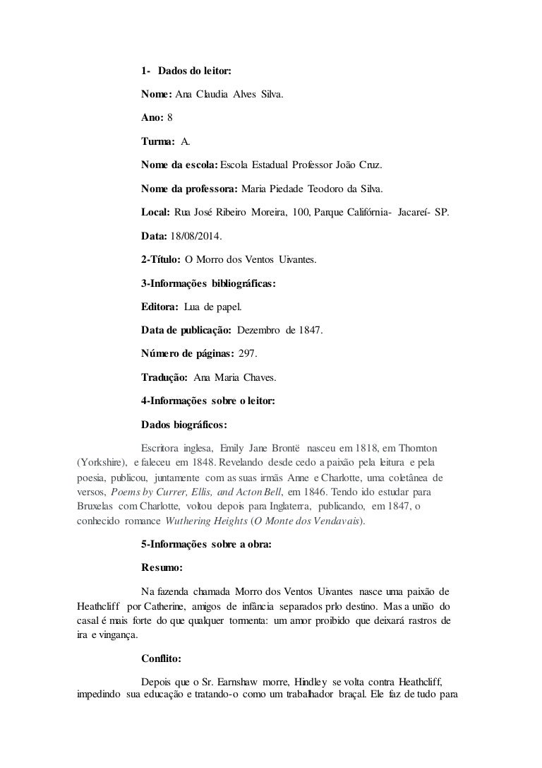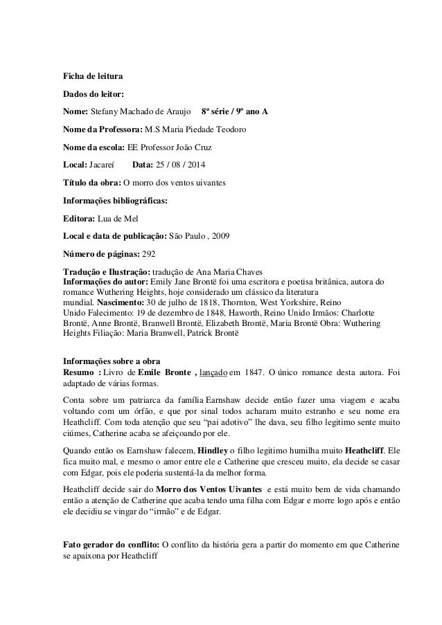 Ficha De Leitura Do Livro O Morro Dos Ventos Uivantes