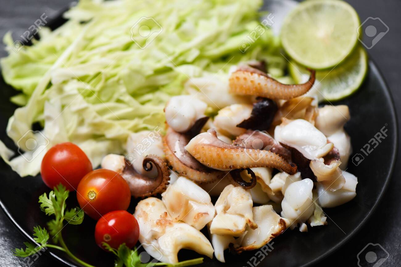 Squid Salad With Lemon Herbs And Spices On Dining Table Tentacles