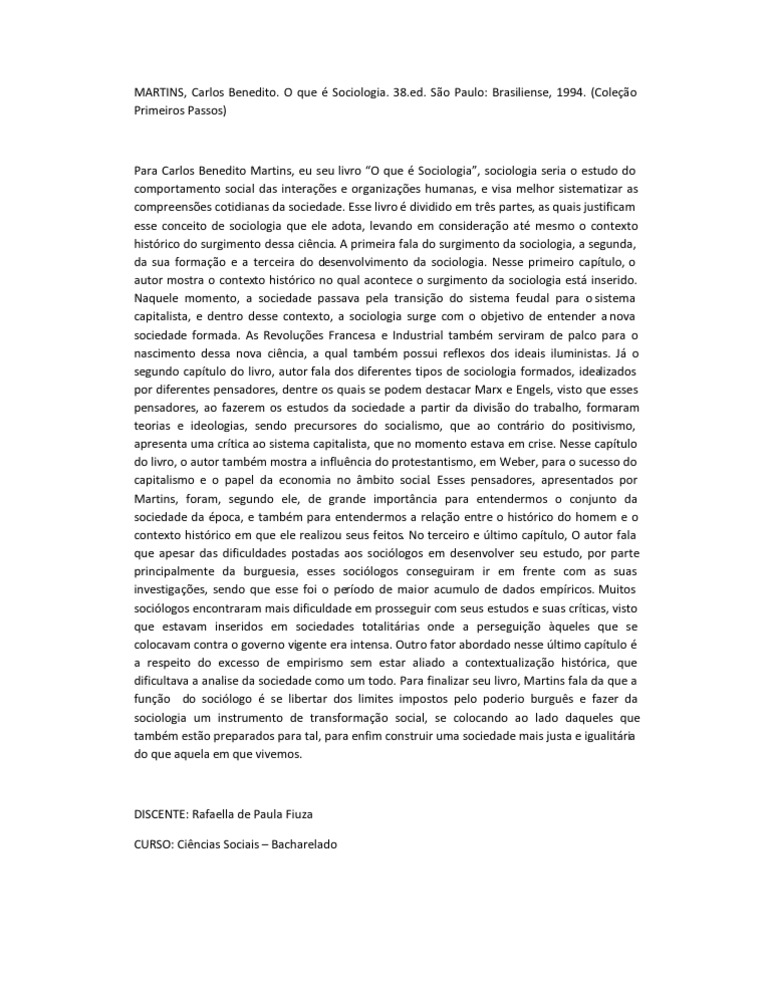 Resumo Do Livro O Que é Sociologia De Carlos Benedito Martins